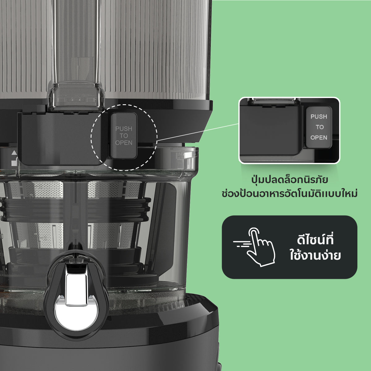 หลังจากการคั้นน้ำเสร็จ เพียงแค่กดปุ่มแล้วหมุนด้ามจับทวนเข็มนาฬิกา ก็สามารถเปิดช่องป้อนอาหารได้อย่างง่ายดาย