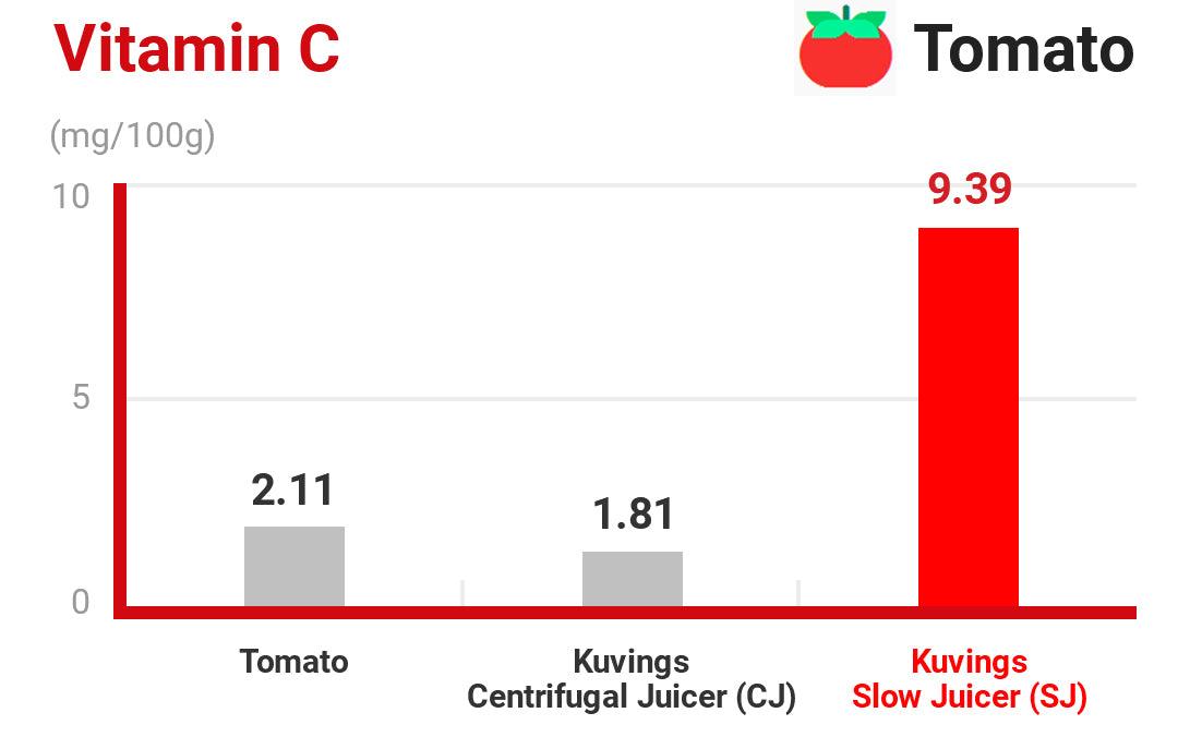 ปริมาณวิตามินซีในน้ำผลไม้ที่เตรียมโดยเครื่องคั้นน้ำผลไม้แบบช้าจะสูงกว่าวิตามินซีในน้ำผลไม้ของเครื่องคั้นน้ำผลไม้แบบแรงเหวี่ยงถึง