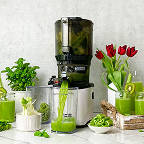 เทคโนโลยีสูญญากาศป้องกันการเกิดออกซิเดชันของอาหารและให้วิตามินและสารอาหารในระดับสูงสุดเมื่อเปรียบเทียบกับเครื่องปั่นแบบหมุนเหวี่ยงทั่วไปของเรา