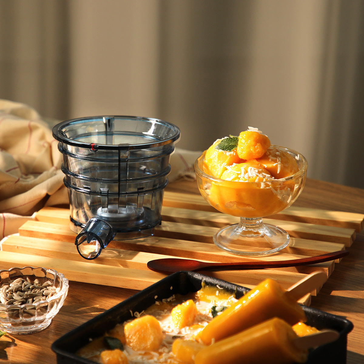 เพียงติดที่กรองเข้ากับเครื่องคั้นน้ำผลไม้ ใส่ผลไม้แช่แข็งที่คุณต้องการ และดูว่า Kuvings ของคุณเปลี่ยนให้เป็นซอร์เบต์เนื้อเนียนและครีมได้อย่างง่ายดาย